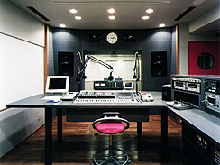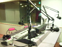 | FM岡山第1スタジオ 牛嶋はいつもこのピンクの 椅子に座って放送している。 |