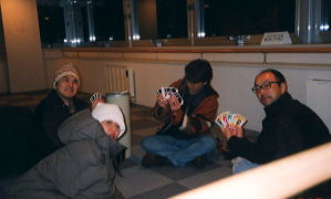 夜10:00。一向に空が晴れない。それぞれ、煙草、おトイレ、仮眠など取りな がらジッと待つ。でも晴れない。『おぉ~し!こうなりゃUNO・10番勝負だっ !!』と、またしてもUNOに興じる面々。